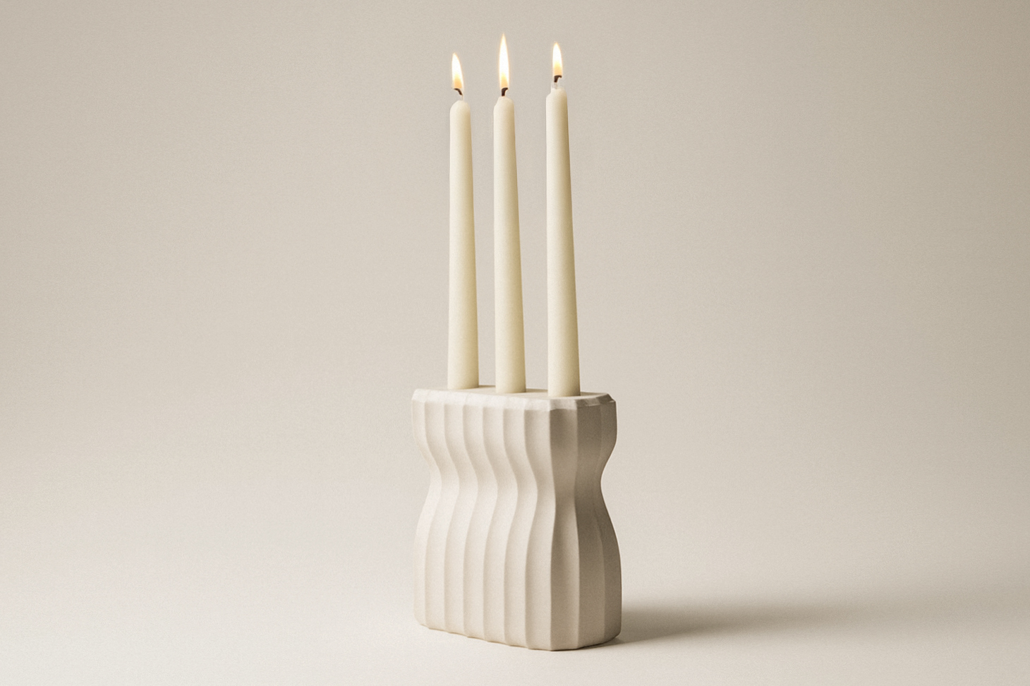For my candelabra, I reimagined these fluted textures in ceramics, applying them to a silhouette inspired by traditional candle holders. The bottom-heavy form nods to the visual languge of mid-century modernism. In addition to catching light, the flutes provide channels for overflowing wax as it melts down the side of the candle holder.